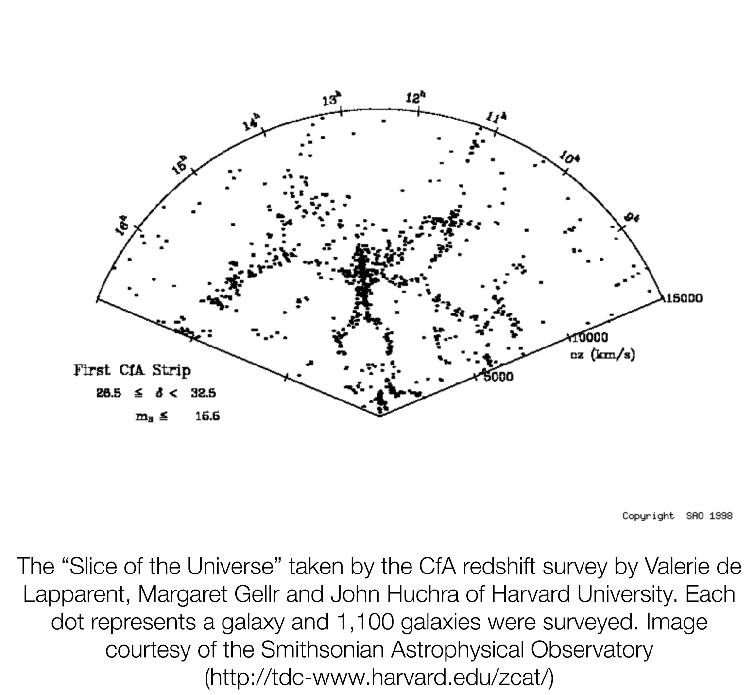 Vogeley can trace the roots of his passion for voids to an exact moment in the 1980s. He was an undergraduate at Princeton, sitting in the university tearoom, when the chair of astrophysics, Jerry Ostriker, came running in, excited.He threw an image of a slice of the universe on one of the tables, and challenged the students to explain it,” Vogeley recalls. The image, from a preprint by Harvard astronomers, charted the positions of over a thousand nearby galaxies (see image below, Lapparent, Geller & Huchra (1986)). The galaxies were not dotted randomly across the slice of the sky, but distributed along a “cosmic web,” with galaxies clustered together to create filaments and threads, separated by unexpectedly huge volumes of nothingness, spanning hundreds of millions of light-years. “These new data revealed a striking pattern, the first clear evidence of a cosmic web,” says Vogeley.