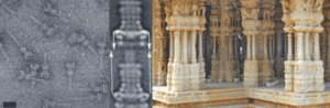 A cluster of bacterial injection system needles (left) and a single bacterial needle (center), credit Dipshikha Chakravortty. “Stambhas” or temple pillars in Hampi, India (right), credit Roman Saienko (Pexels).